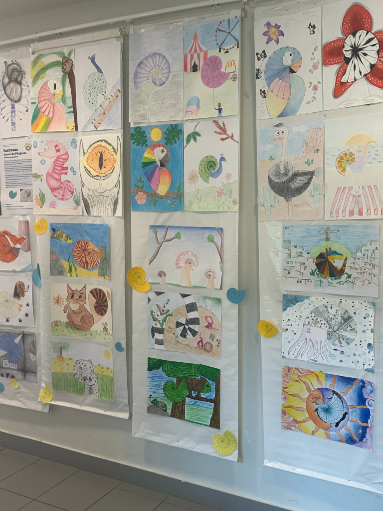 da construção rigorosa do Caracol de Pitágoras, realizada na disciplina de Matemática. Para tal, os alunos inspiraram-se em diferentes imagens pesquisadas de animais e objetos do quotidiano. Paralelamente, os alunos foram convidados a participar numa