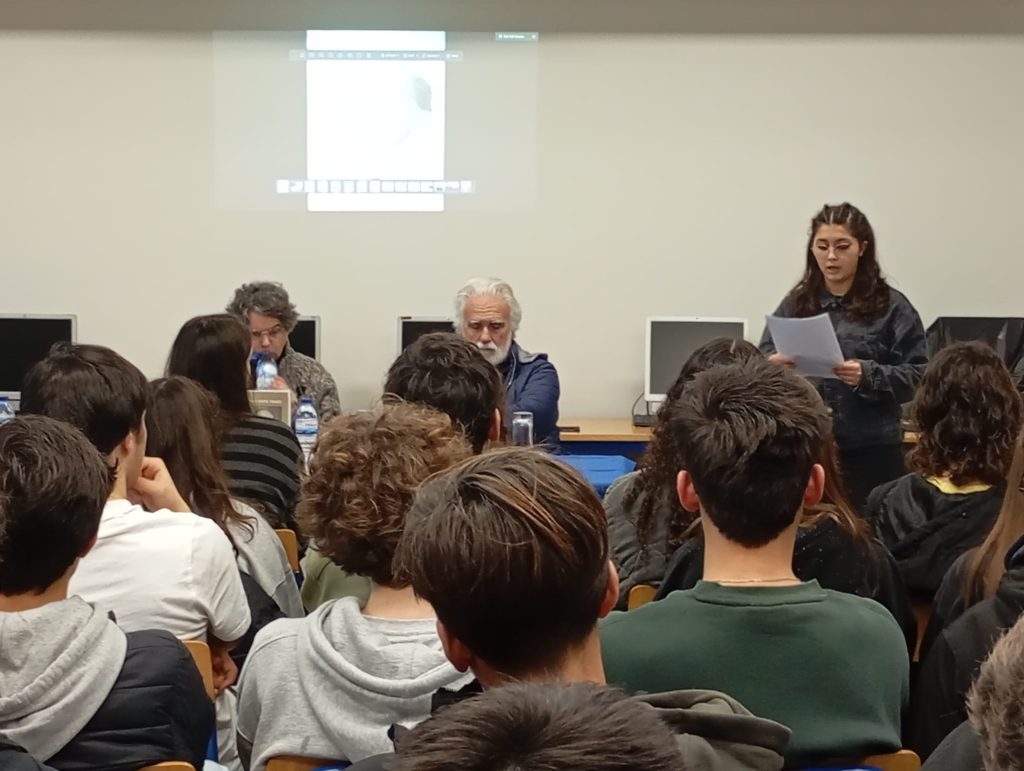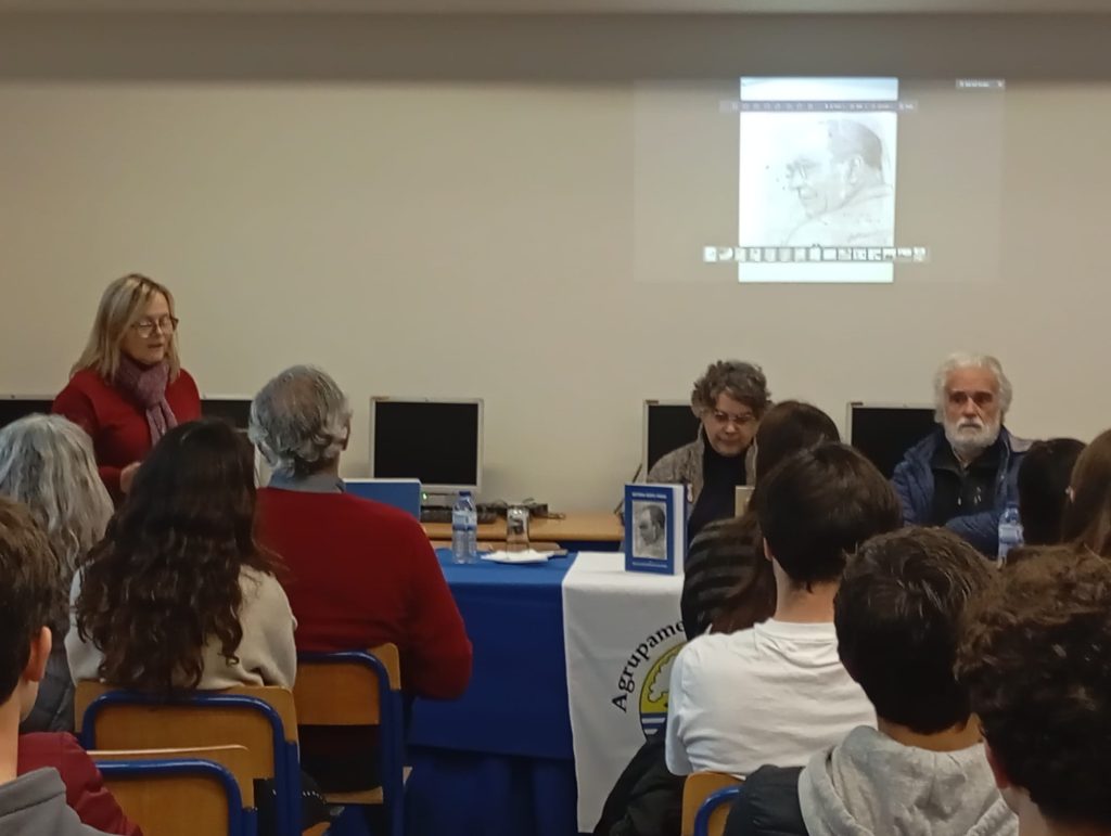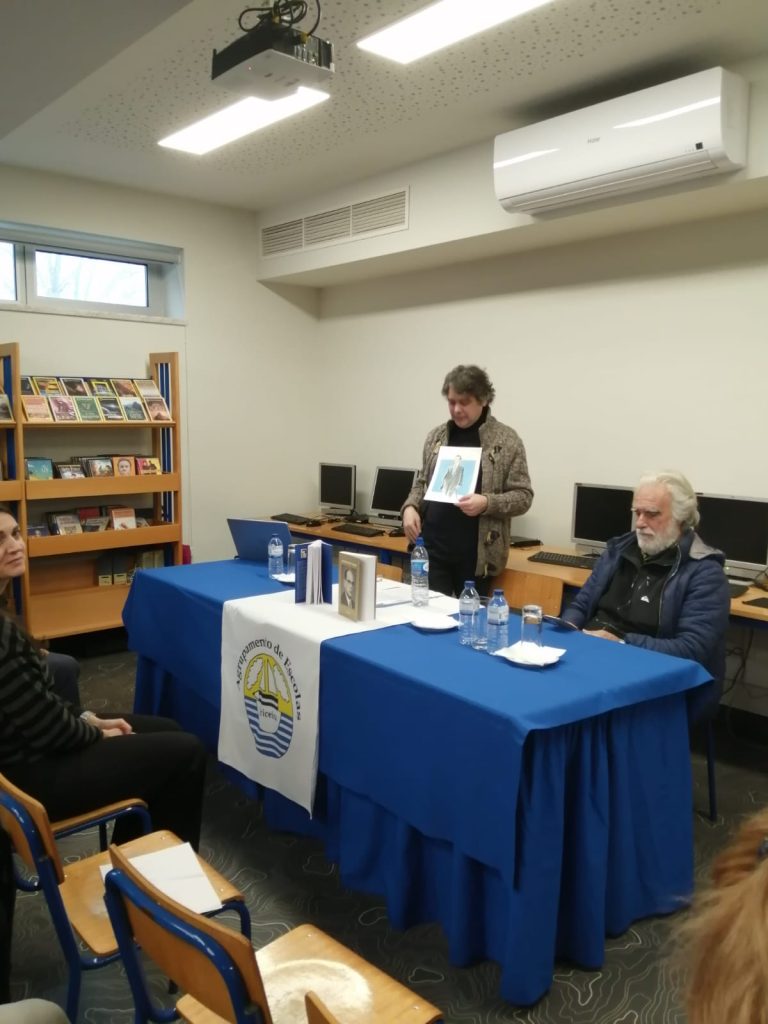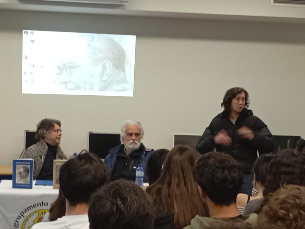 futuro”, para alunos do 9º ano. Na Biblioteca recebeu-se o editor e ex-aluno Pedro Crisóstomo, que palestrou sobre “António Bento Franco” para duas turmas do 10º ano, fazendo-se acompanhar de seu colaborador Francisco Esteves e de António e Cristina Bento Franco, netos do Patrono; o encontro foi iniciado por três alunas do clube Veredas da Leitura, declamando