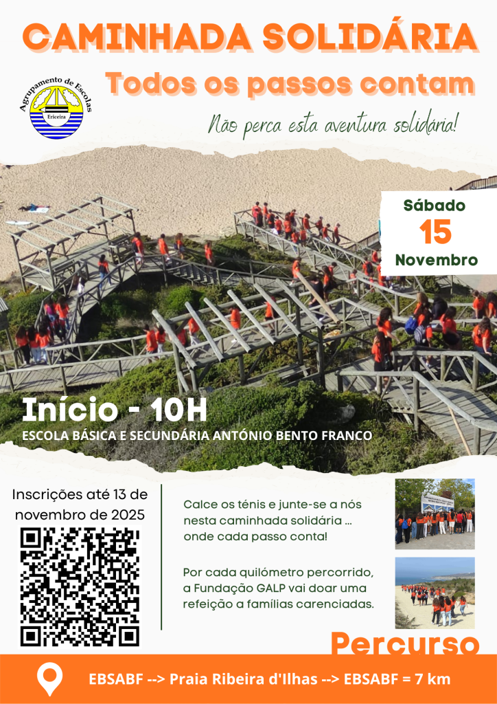 A Escola Básica e Secundária António Bento Franco convida toda a comunidade escolar a participar na Caminhada Solidária, a realizar no dia 15 de novembro de 2025 (sábado), pelas 10h00.  Esta caminhada tem um total de 7 Kms (Escola – Praia de Ribeira de Ilhas – Escola) e apresenta
